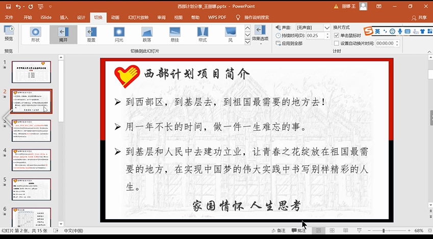 随后,本科工商管理1601班王丽娜从项目简介、服务内容、招募流程及培训方案四个板块对华中科技大学大学生志愿服务计划进行了详细介绍。在项目简介中,王丽娜表示“到西部去,到基层去,到祖国最需要的地方去”是每一位想要参与西部计划的学生的内心呐喊,也是对西部计划内核的简要概括。同时,她也对于西部计划的基本信息、服务专项、政策保证作了简单描述。结合实际课表,王丽娜阐述了关于实际服务教学中的计划,并对服务地和学校两方的相关工作内容及要求进行了强调。在对招募流程的详细说明后,她进一步根据流程对报名、笔试、面试等方面展开分析,分享了自己的经验和技巧。她表示西部计划培训方案将立足实际,成员将在创新实践中发展理论,在实际工作中得到成长。