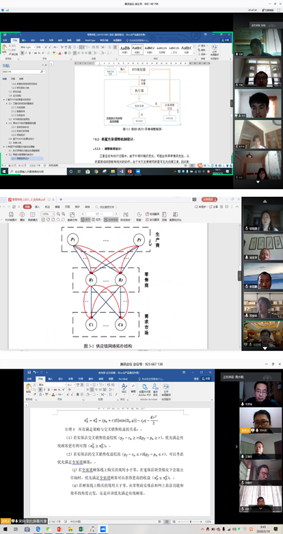 5月9日到10日,生产运作与物流管理系通过腾讯会议平台组织毕业论文预答辩。在预答辩过程中,每个同学在规定时间内深入浅出地阐述毕业设计课题的研究背景、研究思路、研究方法、技术路线、研究结论和启示建议等内容。每组导师在充分肯定学生们研究成果的同时,重点针对目前学生在论文研究与撰写过程中存在的问题进行线上指导,提出具体的修改意见和修改方法建议。例如,定清教授提出了理论性创新论文的标准研究过程和要求,拓宽了学生们研究的知识面和方法论;刘志学教授针对学生们普遍存在的论文结构和章节布局问题进行具体指导;邓世名教授就学生论文中出现的数据处理和数学模型求解问题提出具体建议;徐和教授听完学生论文陈述后,进一步询问了模型参数设置问题,并表示如果要在这个方向深入研究可以尝试做灵敏度分析;祁超教授和李锋副教授指出学生们可以在论文中单独添加一节,用于阐述论文的创新点和前人研究的不同之处;李昆鹏教授针对涉及运用启发式算法求解的论文,要求学生在论文中增加算法选择说明方面的内容。此外,就学生论文中的参考文献格式、文献引用、图表规范等问题,导师们也给出了很多针对性的建议。
