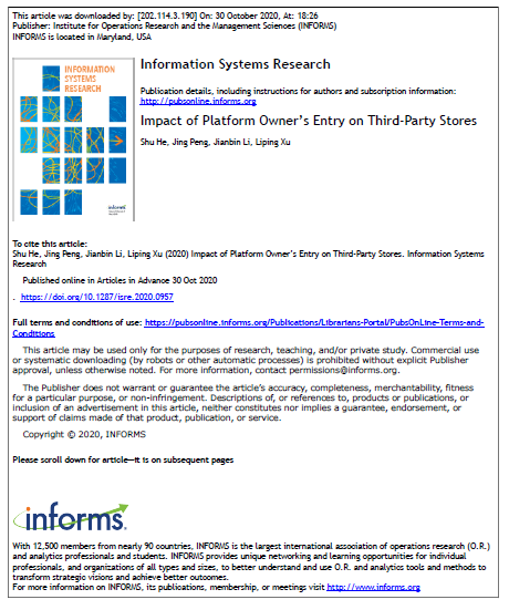 (Bevictor伟德新闻宣传中心记者 韩海韵/文)10月30日,Bevictor伟德管理科学与工程专业研究生、Robust Team成员徐礼平同学与导师李建斌教授(通讯作者)、美国康乃狄格大学助理教授Shu He和Jing Peng合作撰写的论文“Impact of Platform Owner’s Entry on Third-Party Stores”在UTD24期刊Information Systems Research(ISR)上在线刊出。
