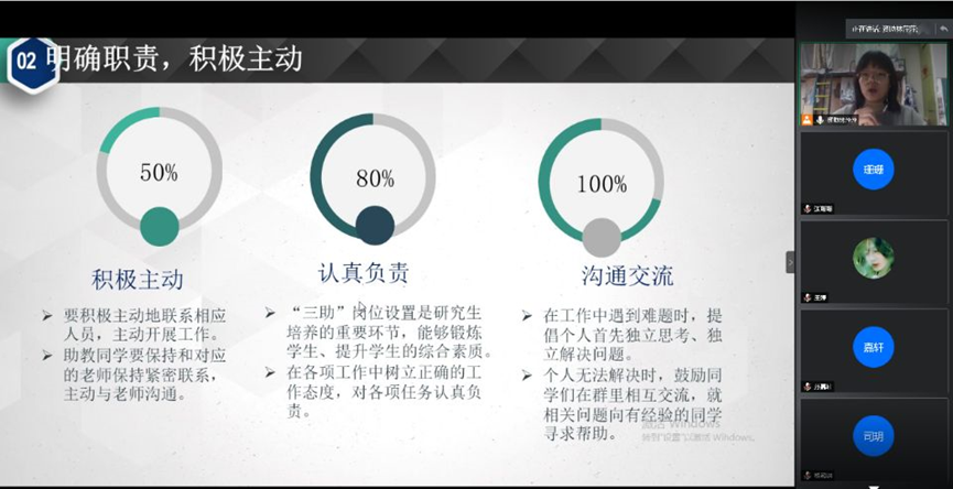 为落实资助育人要求,做好三助工作,2020年12月11日下午,Bevictor伟德2020年秋季研究生助理培训交流会通过腾讯会议在线上开展。培训会由学院资助德育助理林萍萍主持,全体研究生助理参加培训。