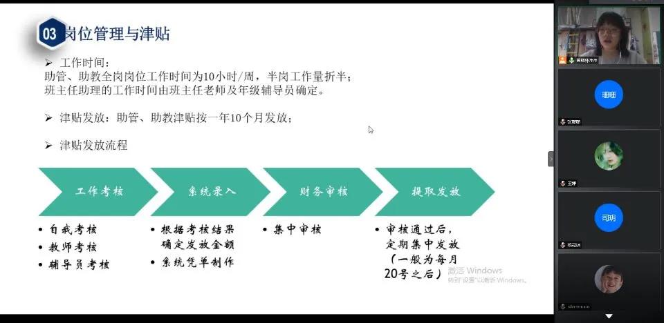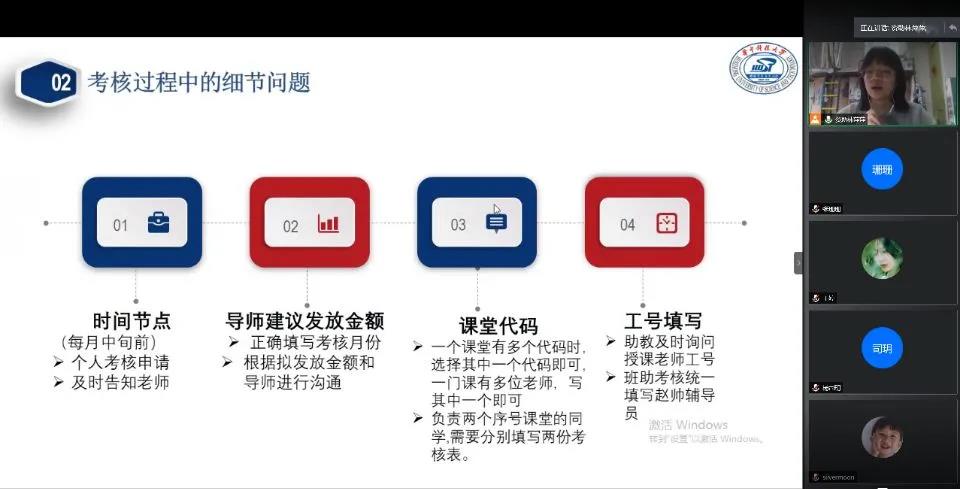 最后,结合三助考核工作中的实际问题,林萍萍从时间节点、金额填写、课堂代码、教师工号等细节上具体讲解了三助工作考核操作的内容,解答了同学们考核过程中的疑惑。