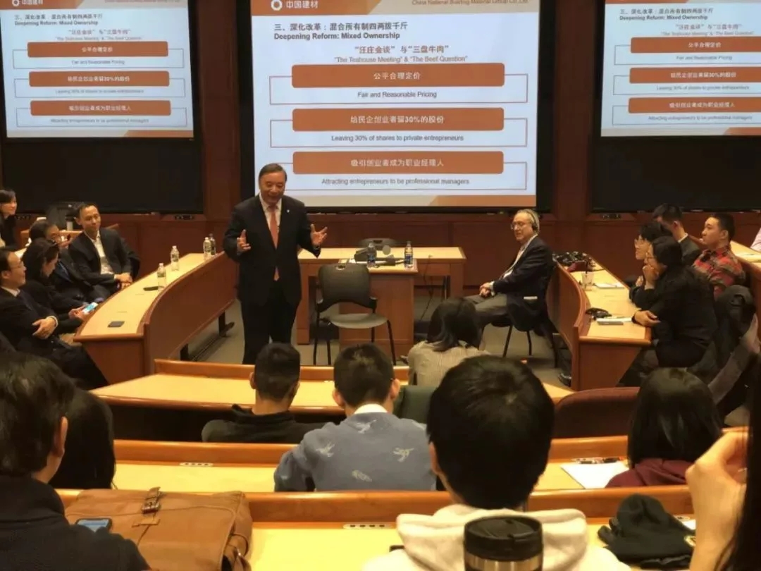 我和鲍沃教授十年前就约定,他希望我来哈佛商学院进行一次案例演讲。大家知道,我是一名央企领导人,如果专门为了来哈佛商学院进行一次案例演讲不太现实,这次是因为去华盛顿在世界银行作为世界水泥协会主席身份做一场关于气候环境的演讲,鲍沃教授就提议我这次应该完成十年前答应的事情,来哈佛商学院给同学们讲讲中国建材成长的故事。我觉得这是非常好的事情,也完成了我多年以前的一个夙愿。我今天来哈佛商学院到得比较早,在整个学院里走了一遭,感觉哈佛商学院实在是太漂亮了,各位同学能在哈佛商学院学习真是人生的一件幸事。同时我也觉得波士顿实在太冷了,没想到会这么冷。但今天在这里,感觉整个屋子还是暖意融融,我想今天给大家讲讲中国建材的故事,也讲讲我本人的经历。