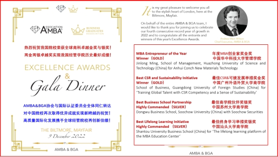 2022/23年度AMBA&BGA卓越奖共设10项奖项,由全球通过AMBA认证和BGA认证的商学院申报参评。在此次申报中,国际事务办公室积极组织申报,准确把握各奖项评选标准,精心修订申报材料,悉心指导面试。经过专家组三个多月的严格审查,MBA校友明金龙凭借一流的创新商业战略和卓越的企业家创业精神一举摘得“年度MBA创业家奖”金奖。这是我院首次在全球商学院卓越奖中获得金奖,也是继我院获得2022年度“最佳终身学习举措奖”提名奖和“年度MBA学生奖”铜奖后,再次在全球商学院卓越奖中摘得奖项。