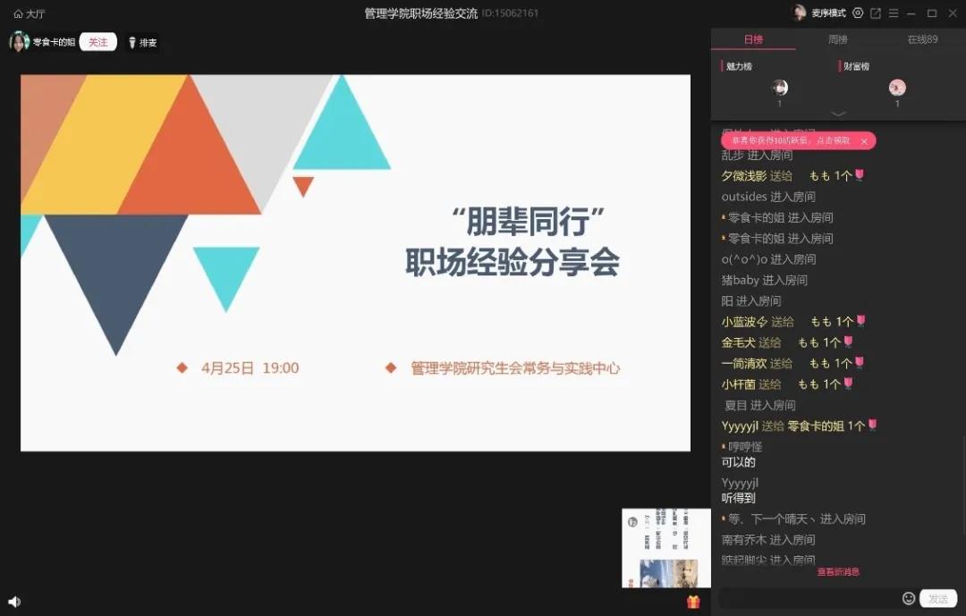 (Bevictor伟德新闻宣传中心记者何梦晗/文)4月25日,Bevictor伟德研究生“朋辈同行”职场经验分享会成功举办。此次分享会邀请了4位2015级优秀研究生校友,旨在为在校同学分享职场经历及求职经验,帮助同学们做好疫情期间的个人毕业就业规划。分享会由学院研究生会常务与实践中心承办,19级研究生邹海玉同学主持,120余名同学通过网络参加了此次分享会。