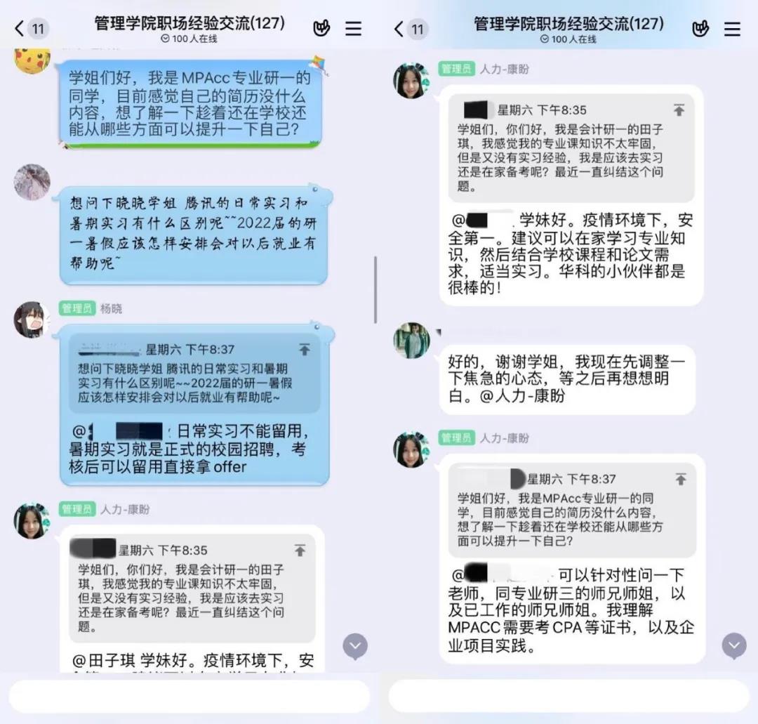 分享会结束后,19级研究生聂泽芳为同学们整理出了文字版经验分享,供大家学习参考。针对大家在QQ群提出的关于考证与实习的时间平衡、技能的提升空间、实习的时点选择以及暑期实习和日常实习的区别等问题,四位优秀毕业生进行了耐心解答,并建议同学们在疫情期间以安全为主,之后再积极投递多做尝试,平时注意在专业课程及应用软件上提高自己的核心竞争力。此次职场经验分享会引起了同学们热烈的反响,许多同学表示收益良多,并盼望以后可以开展更多的求职分享会。