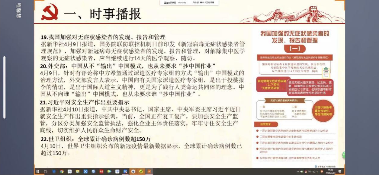 最后,硕士2017级学硕联合党支部成员吴汉芸进行4月时政播报,她详细介绍了全球新冠肺炎疫情信息、疫情防控国际合作纪事与全国扶贫项目开复工提速等,带领全体党员同志深入学习当月时事新闻。