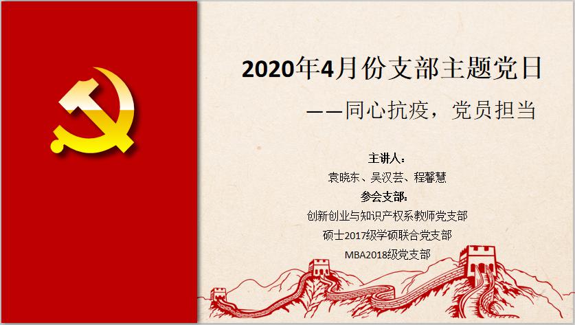 4月23日,创新创业与知识产权系教师党支部与硕士2017级学硕联合党支部、MBA2018级党支部共同开展线上“1+1”联合组织生活会,师生共同学习了习近平总书记有关疫情防控工作的讲话精神和党中央关于疫情防控的决策部署,共同讨论了学生关注的就业毕业问题。教师党支部和学生党支部全体党员、研究生辅导员罗秋韵参加了会议,组织生活会由学硕联合党支部党支书吴汉芸同学主持。