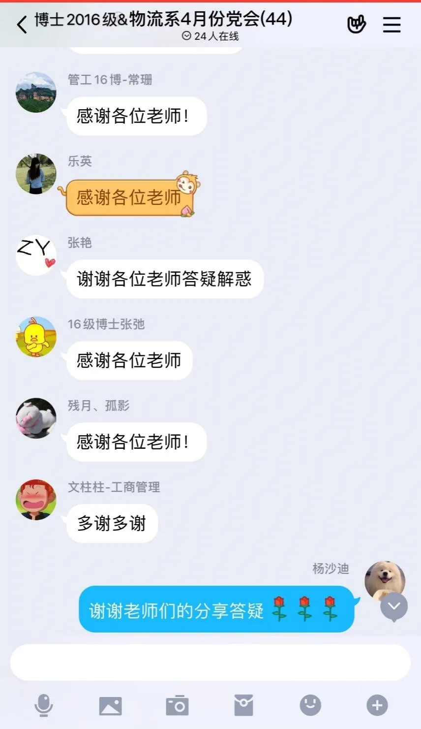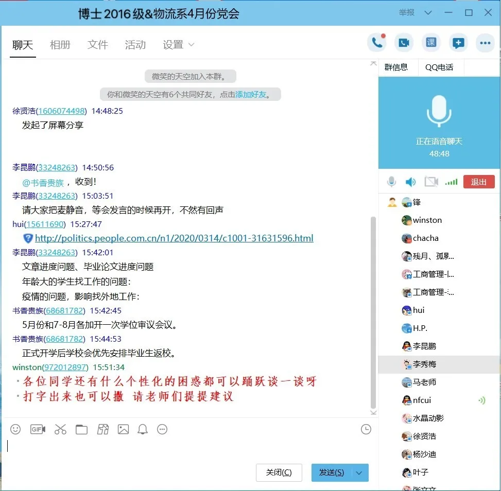 针对学生提出的这些问题,教师支部的老师们也纷纷建言献策,马士华老师表示,疫情期间在家科研确实有困难,对于博士毕业论文,建议大家抓紧放平心态,督促自己抓紧推进毕业论文写作,导师们也会在线上与大家多交流;对于年龄偏大的博士就业问题,要善于排解心情焦虑,试着多找几家企业,针对性的应聘。徐贤浩老师则建议大家做好毕业论文规划,克服困难;在就业方面建议博士毕业生放平心态,多关注企业招聘信息,导师们也将利用自身资源给大家多多提供就业信息。崔南方老师就武汉疫情防控表达了高度评价,对党中央、政府的精准部署给予高度的赞扬,并勉励同学们要向胡鹏老师学习,关键时刻彰显担当;针对毕业论文写作,他表示不能因为困难就耽误自己的科研、论文写作,这次疫情,对学生就业会产生一定的影响,需要大家打开思路,多尝试企业,总的来说,把就业准备做的更细,更精准,增加自身的就业竞争力。除此之外,老师们还将高校、企业招聘信息告知学生,并向对方推荐学生简历。