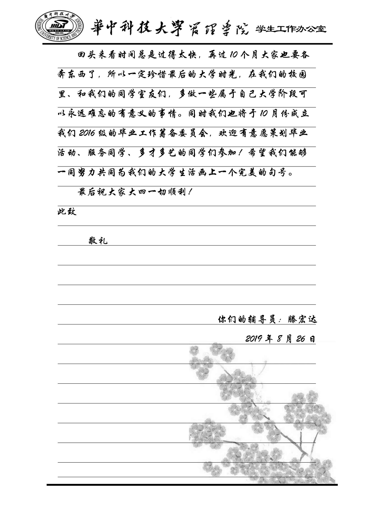 分团委书记滕宏达通过书信给16级全体准毕业生带去了一些叮嘱,他分别以“选择”、“纪律”和“珍惜”来表达对16级学子的关心,希望他们珍惜最后一年的大学时光,为大学生活画上一个完美的句号。