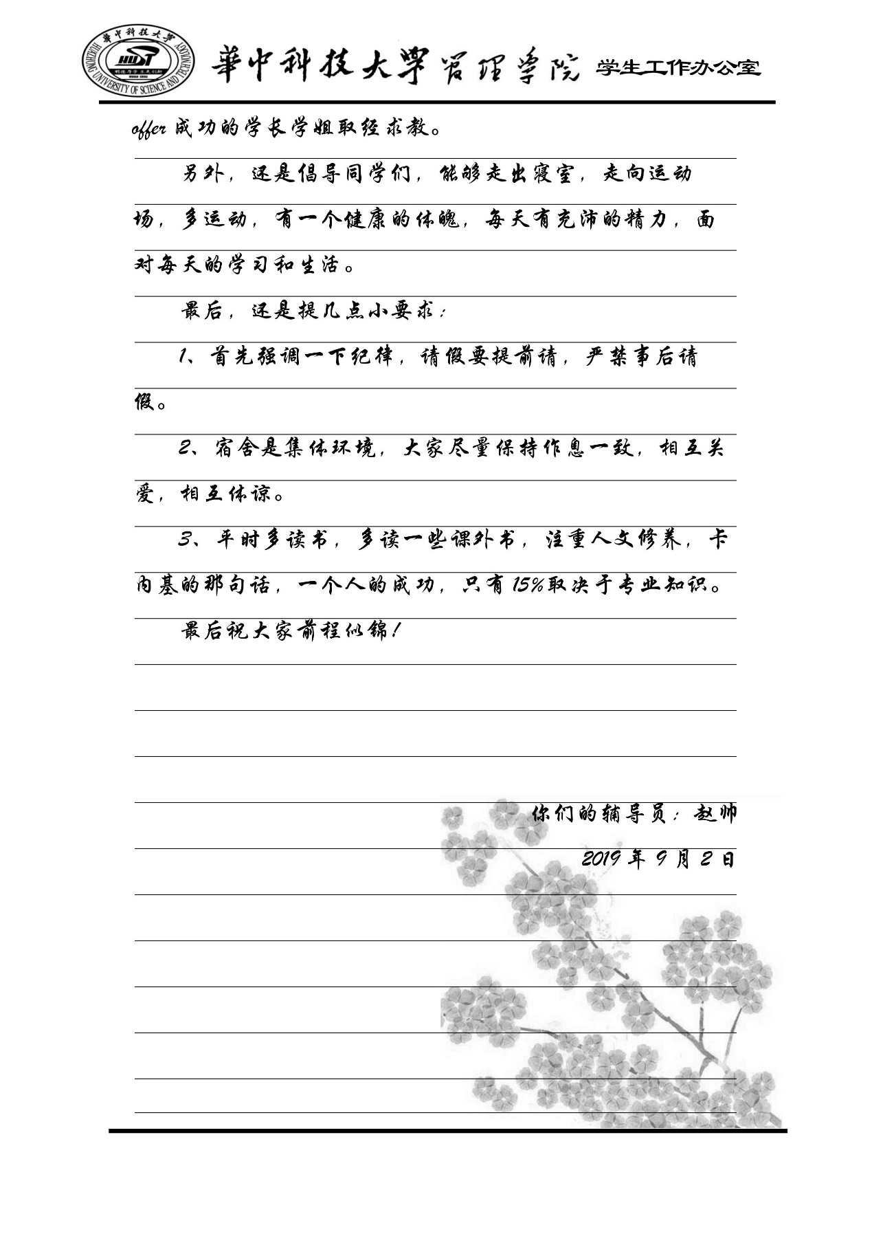 辅导员赵帅则通过书信形式对17级管院学子提出督促与期望,希望已处大三的同学们可以提前为自己的选择做好准备,把握好大学中最重要的一年。并且号召同学们走出教室,锻炼身体,以充沛的体力面对每天的学习和生活。