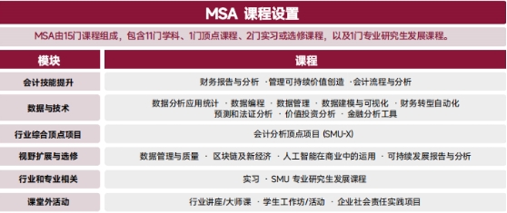 2. 财务大数据分析硕士(MSA, Master of Science in Accounting,Data & Analytics),该项目是亚洲第一个,也是唯一一个财务大数据分析方向的会计硕士项目,均为全英文授课。