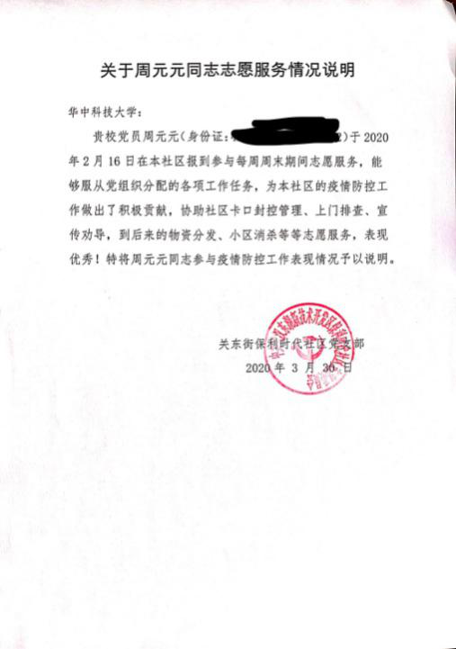 周元元参与了关东街保利时代社区的社区网格防控工作,在疫情初期,积极与小区物业经理沟通,为小区疫情防控和管理献计献策。疫情中,她担任社区服务志愿者,负责社区的卡口执勤、人员登记、体温测量等工作。有时在执勤时遇到小区人员不理解,周元元耐心解释,安抚小区人员情绪。