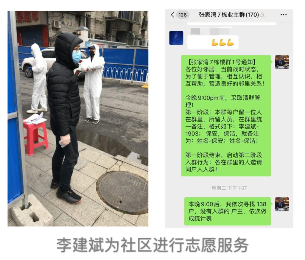 李建斌老师担任了张家湾社区防疫志愿者。他通过建立战“疫”微信群,配合居委会及时解决群众困难,发起楼栋捐款,购买了30套防护服和护目镜捐给志愿者们,并参与了省直医院志愿执勤工作。结合实践,李建斌撰写了《武汉市社区防疫措施与建议--以张家湾小区为例》,分析问题并给出六点建议。