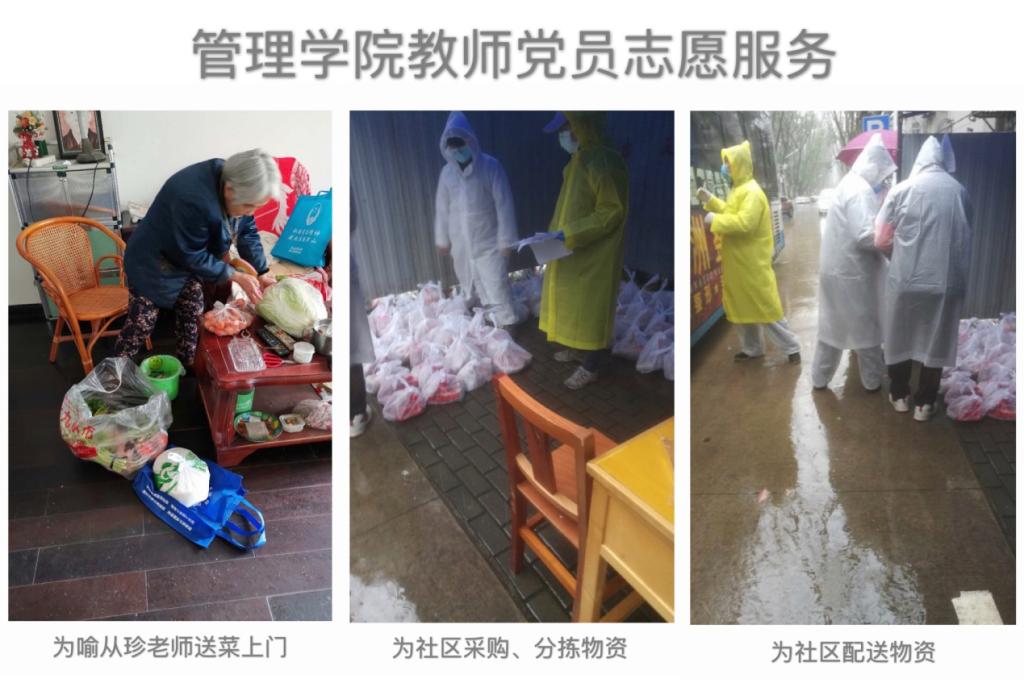 学院教师除参与校园防疫工作外,李建斌教授、马辉民副教授、周元元副教授等教师还积极投身于所在社区的防疫志愿服务工作。自疫情爆发以来,马辉民在关山口社区、联投喻园小区担任防疫志愿者,协助小区物业为业主团购需要的各种生活物资,每天负责物资的分发工作,并主动为年纪较大,行动不便的小区住户将购买的物资送货上门。