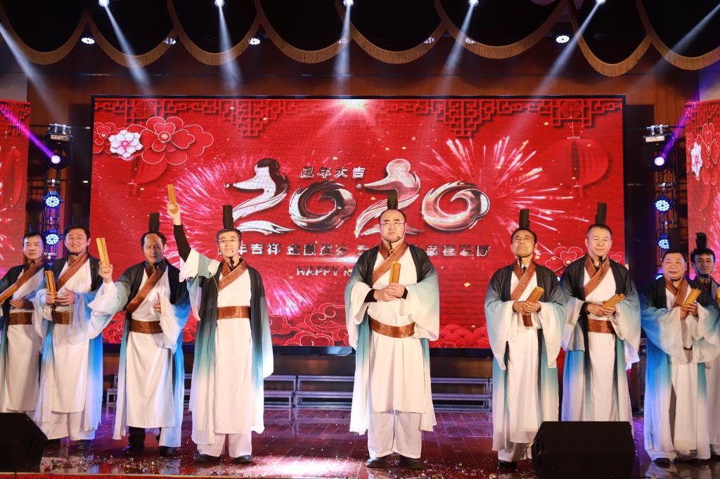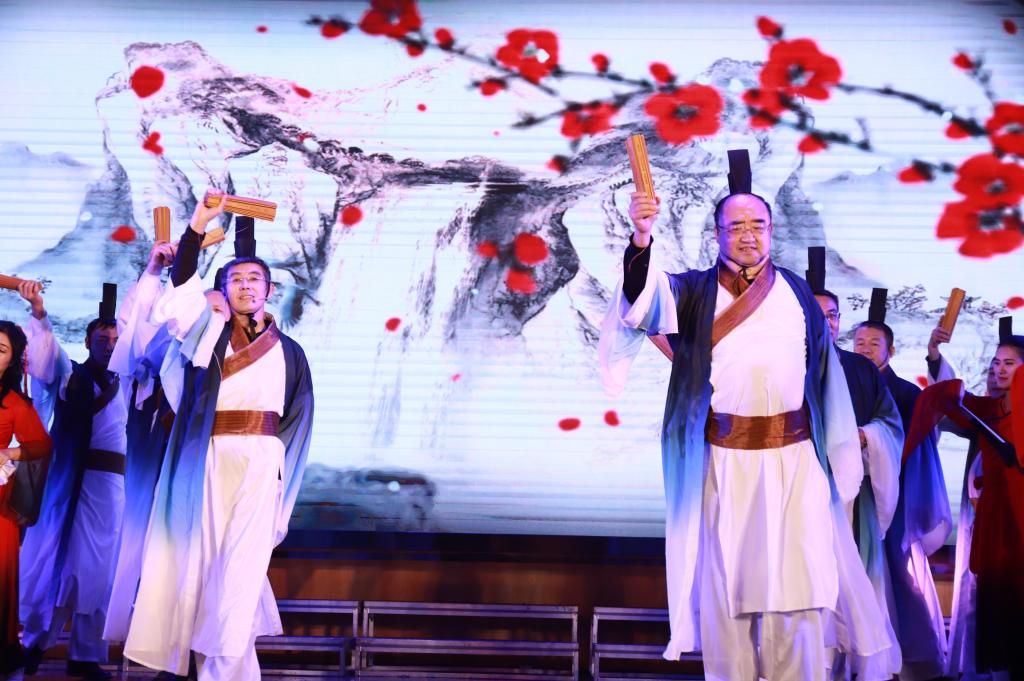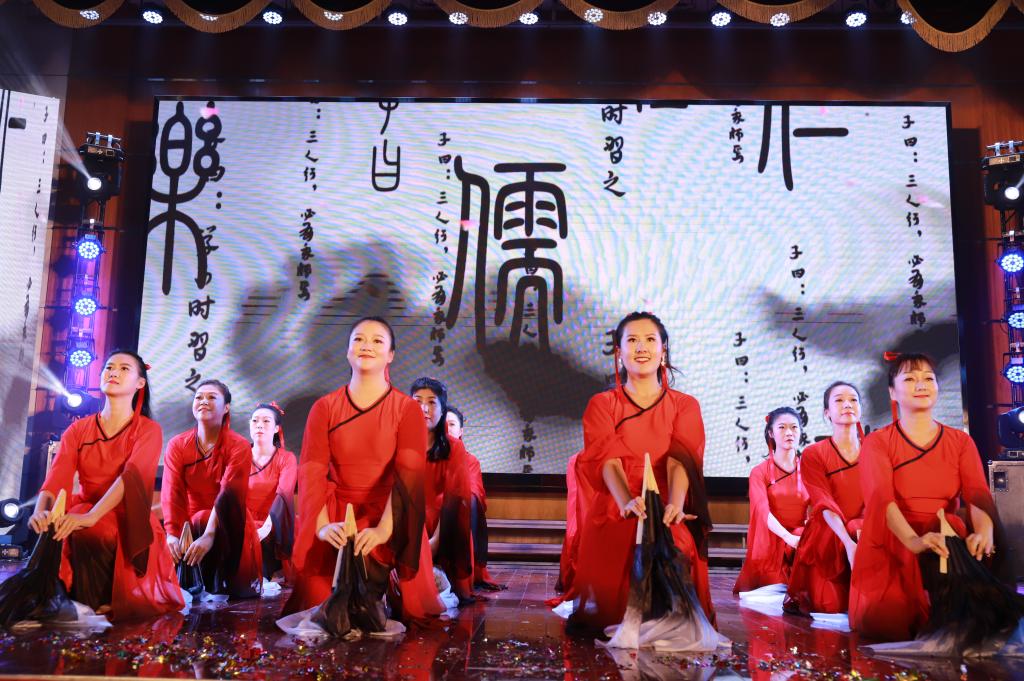 最后,学院党政领导班子全体成员和院机关员工共同带来竹简舞《舞墨书香》,从书简到书本再到书卷,学院领导、员工用舞蹈向全体师生表达了新年的祝福。